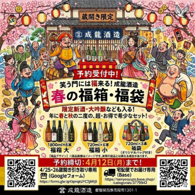 4/12(日)お申し込み締切です。蔵開き当日の販売はありません。ご注意ください。 笑う門には福来る、蔵開き恒例の「福箱&福袋」のご案内です。1年...