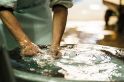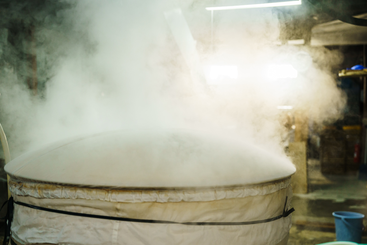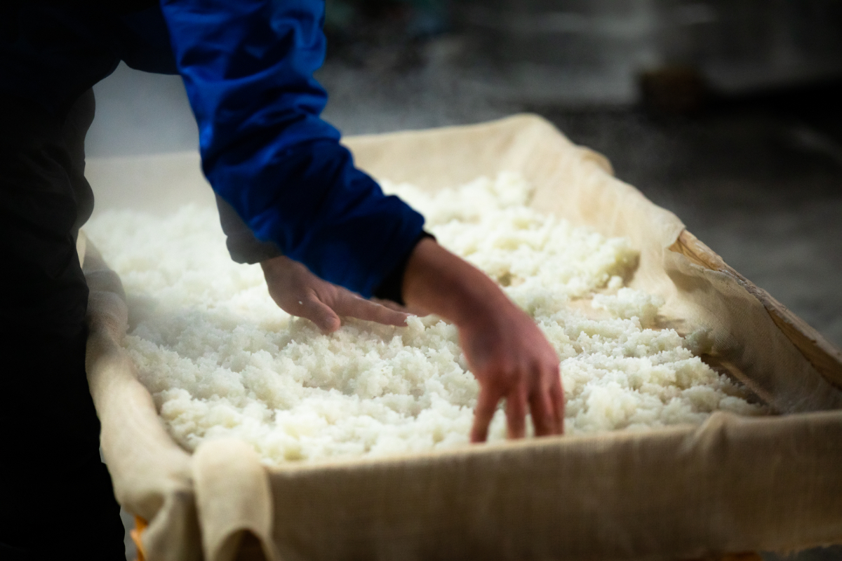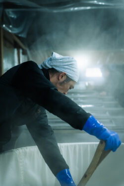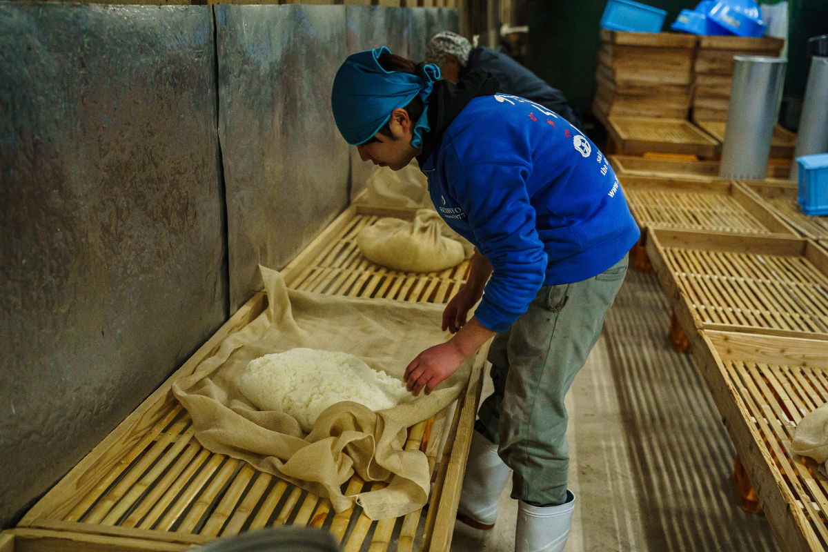 酒造りで重要なのが麹づくりです。蒸し米に種麹を植え付け、温度と湿度の管理を徹底し、何度も手入れをしながら麹菌を育てていきますが、米の固さ・やわらかさ、水分量などの状態によって麹の育ち方は違ってきます。長年の経験によって麹の状態を見極め、良い麹づくりを行うことが良い酒造りに繋がります。
